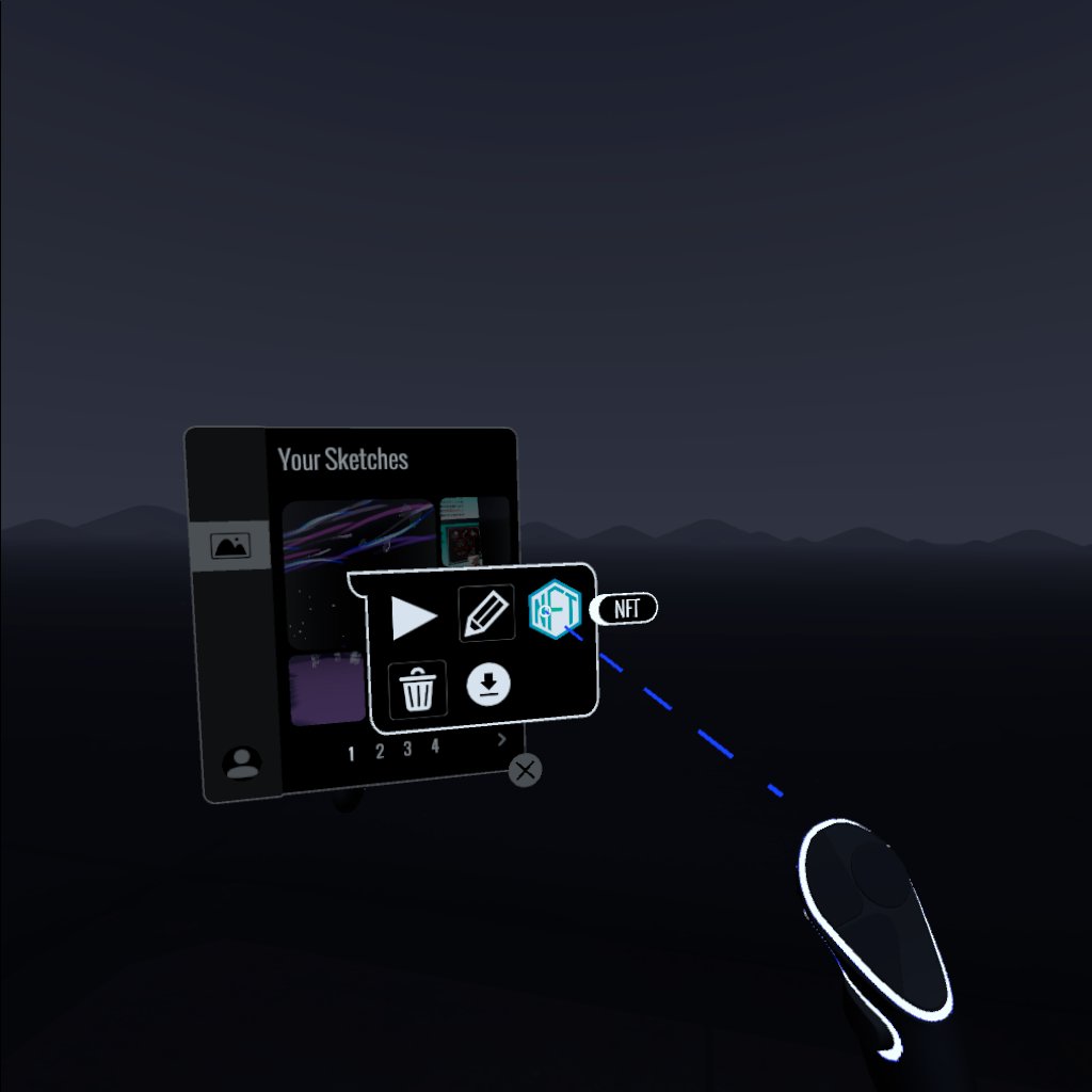 Step 2. After creating your VR art on SnowCanvas, select the art you would like to turn into an NFT from the art list in sketchbook, located on the lower part of your left hand palette. Then, select the NFT icon out of the list of icons that appear.